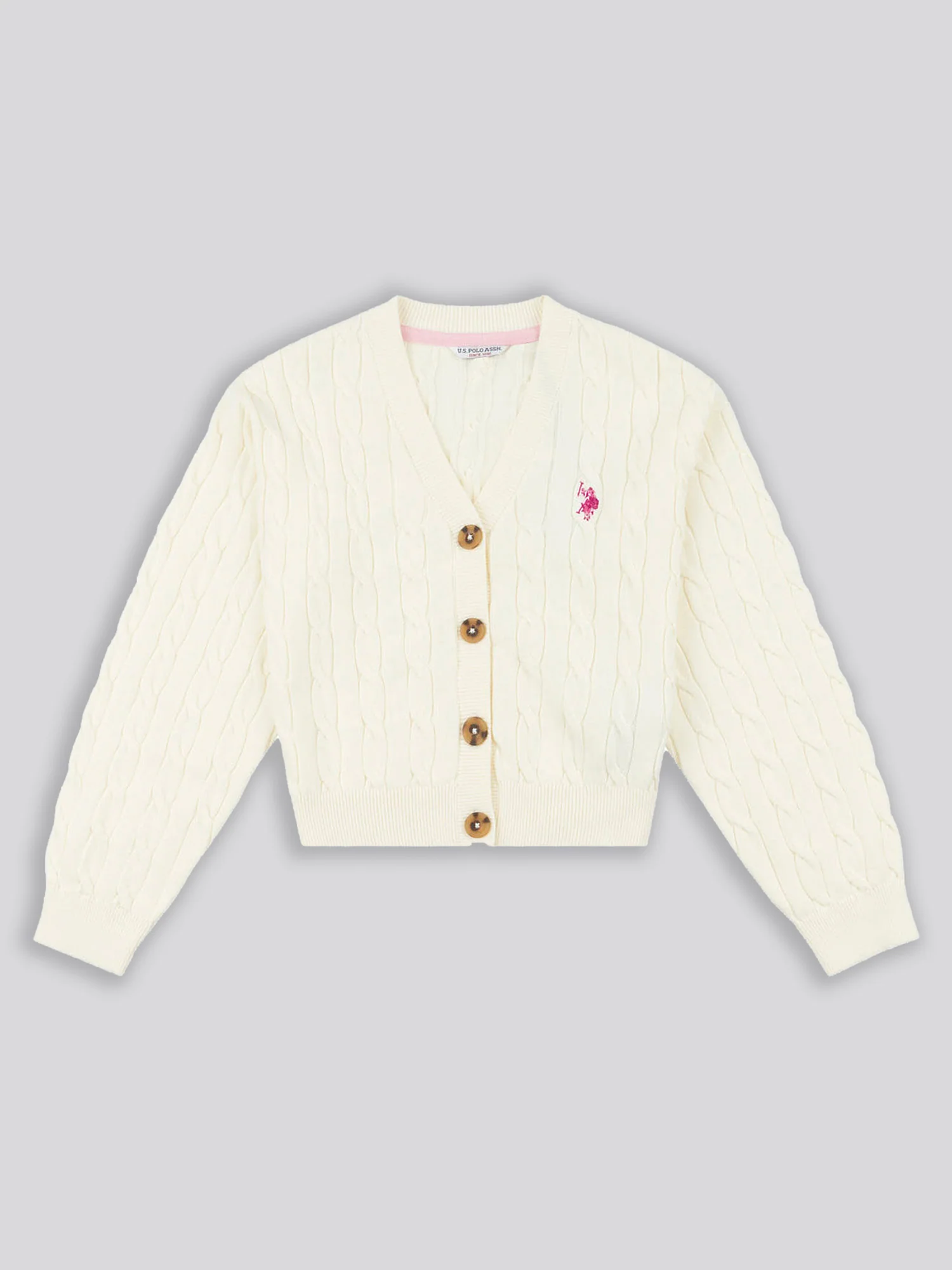 Introduce her to timeless style with this beautifully crafted cable knit cardigan, designed to blend elegance with practicality. Made from luxury pure cotton, this piece is as comfortable as it is sophisticated. The intricate cable knit pattern and subtle rib detailing provide a classic touch, while the branded horn-effect buttons add a refined finish. Pair with a flowy skirt for a polished look or layer over a casual dress for effortless charm.