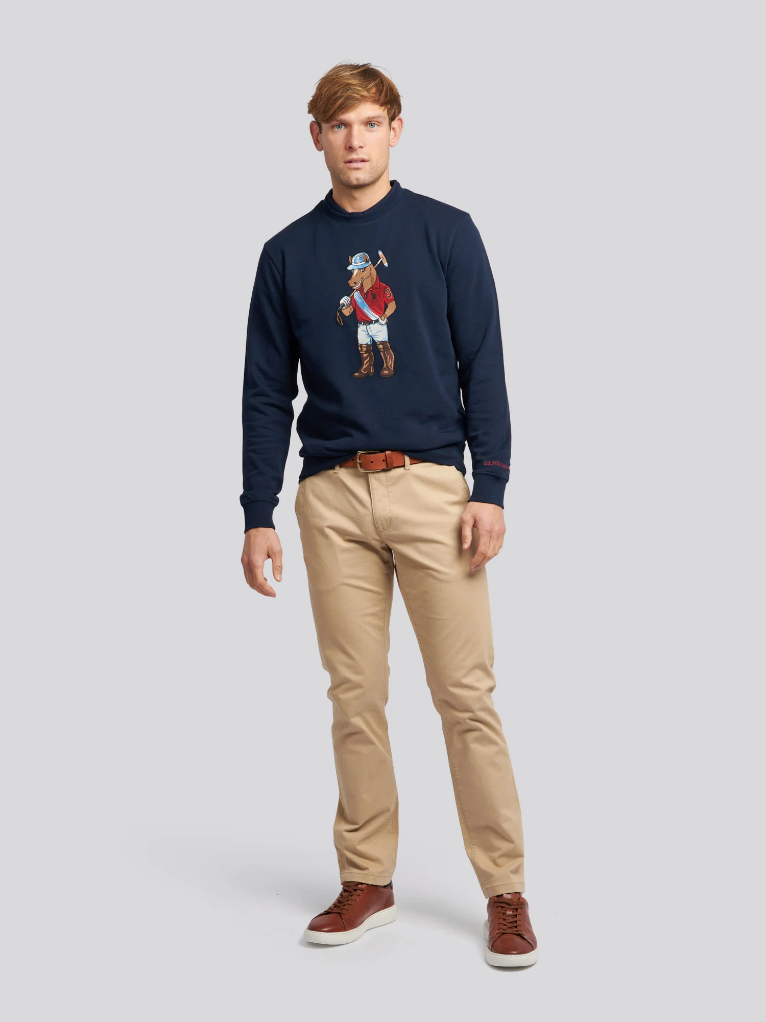 Showcase style and character with this U.S. Polo Assn. Mens Chuck Crew Sweatshirt. Crafted from a soft, smooth loopback cotton, the relaxed sweat features the label's enigmatic Chuck motif as a large print on the front. Ribbed trims at the collar and cuffs ensure a comfortable fit, making it perfect for off-duty dressing. Wear with matching joggers to navigate your day with style and ease.