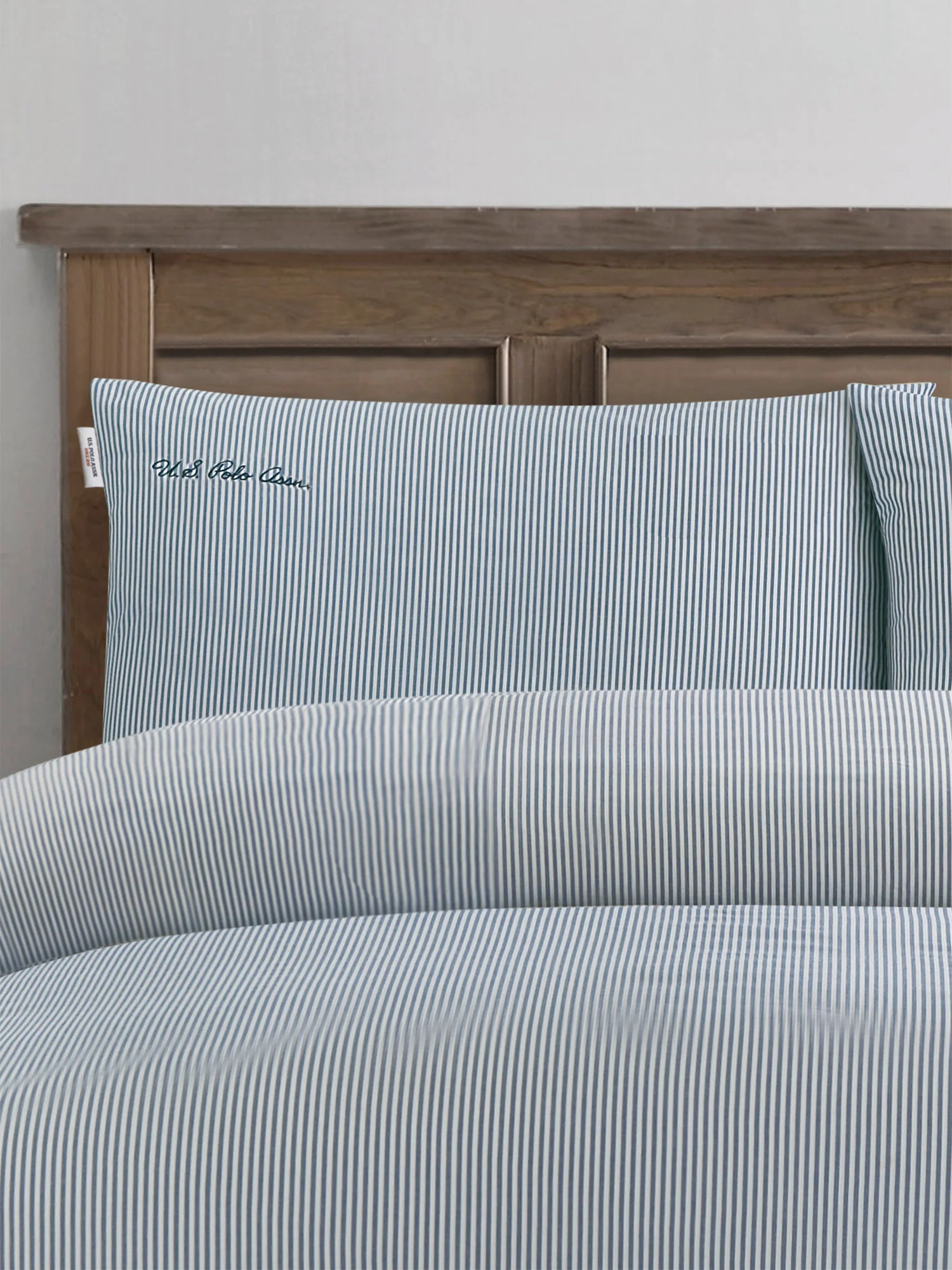 Elevate your bedroom with the U.S. Polo Assn. Pure Cotton Stripe Duvet Set. Made from 100% cotton with a luxurious 200 thread count, this set offers a soft, breathable feel. The crisp striped design exudes classic style, complemented by the signature embroidered logo and branded tab details for a refined touch. Perfect for those who appreciate understated elegance, pair it with solid-toned throws or pillows for a polished, timeless aesthetic.