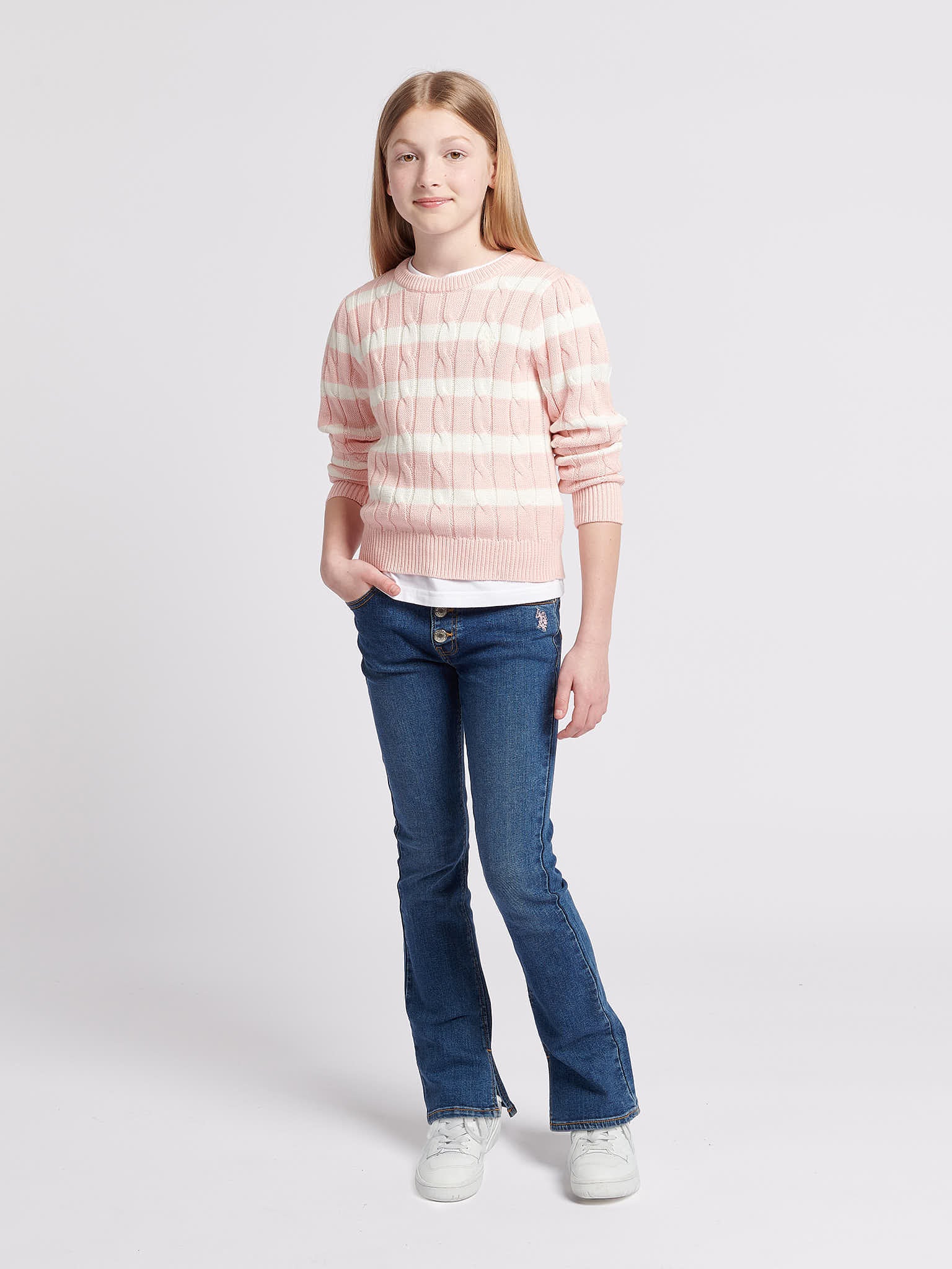 The U.S. Polo Assn. Girls Stripe Cable Knit Jumper combines timeless style with a nod to heritage. Crafted from a luxury cotton blend, this jumper offers a soft, premium feel and features a twist cable knit design in a relaxed fit, making it perfect for layering. Ideal for pairing with jeans or skirts, this jumper seamlessly blends elegance with cosy comfort.