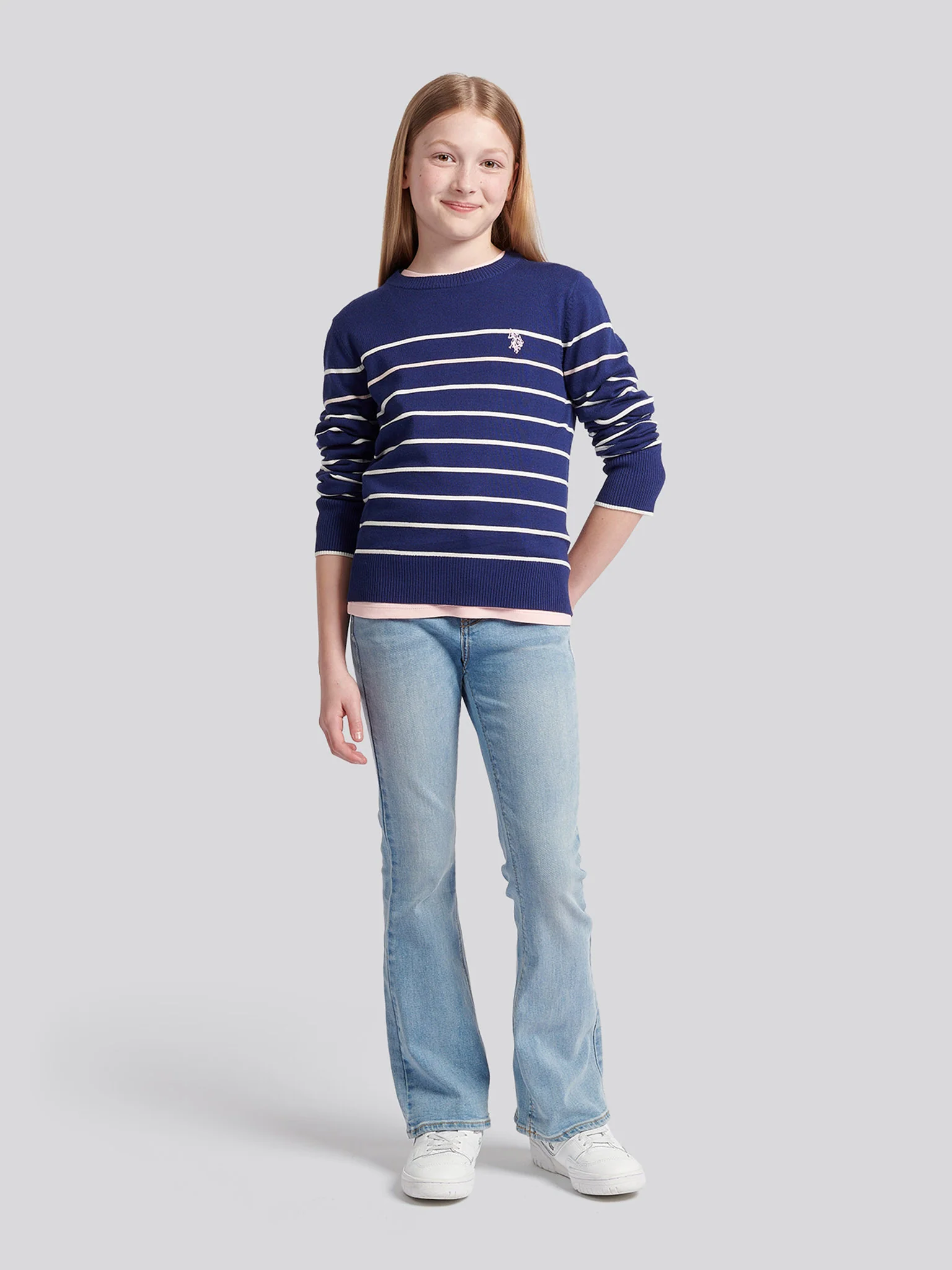 The U.S. Polo Assn. Girls Stripe Crew Jumper combines timeless style with luxurious comfort. Crafted from the finest quality yarns, this jumper features a relaxed fit and classic horizontal stripes, making it a chic addition to any wardrobe. Ideal for layering over jeans or a skirt, this jumper effortlessly elevates everyday outfits.